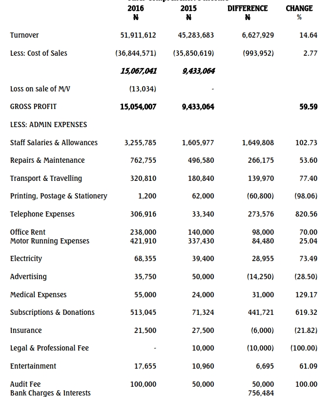 The following is the statement of Profit or Loss and other comprehensive income of ABRICON NIGERIA LIMITED for the year ended December 31, 2016.