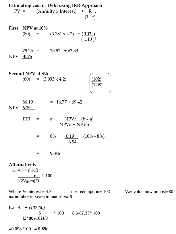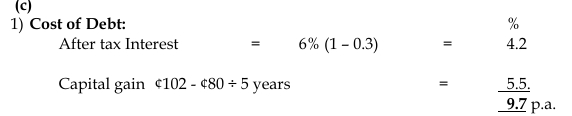 c) Ten years ago, Brown Limited issued GH¢2.5 million of 6% discounted debentures at GH¢98 per 100 nominal. The debentures are redeemable in 5 years from now at GH¢2 premium over nominal value. They are currently quoted at GH¢80 per debenture ex-interest. Brown Limited pays corporate tax at the rate of 30%.