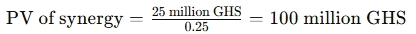 Two-Pack has 40 million shares and a P/E ratio of 18, while Anas-Expo has 25 million shares and a P/E ratio of 12. Directors of Two-Pack have decided that Two-Pack takes up all the equity shares in Anas-Expo by offering to its shareholders one new share for every share they hold. They have also decided that Two-Pack mechanizes Anas-Expo’s production process immediately at the cost of GHS18 million, replacing work currently done by hand. It is estimated that operational efficiency arising from the acquisition and integration of the two companies would yield after-tax benefits of GHS25 million per year to perpetuity. The cost of capital of Two-Pack is 25%.