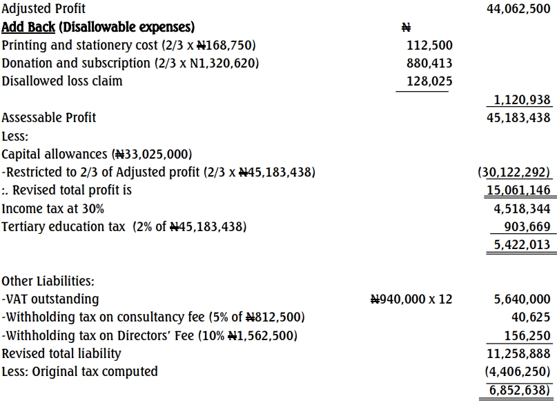The accounts showed Adjusted Profits of N44,062,500, and Capital Allowances totaled N33,025,000. The tax liability arrived at was N4,406,250. The tax officials were not satisfied with the explanations received in connection with the Withholding Tax on the Director’s fee of N1,562,500, as well as Consultancy fee of N812,500. They also decided to write back 2/3 of the following expenses: