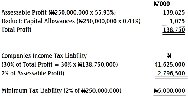 Since the company’s income tax computed under normal assessment is greater than the minimum tax liability, the company’s income tax of N41,625,000 is payable.