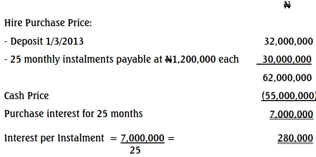• The company purchased an excavator on hire purchase on March 1, 2013, and paid a deposit of N32,000,000.