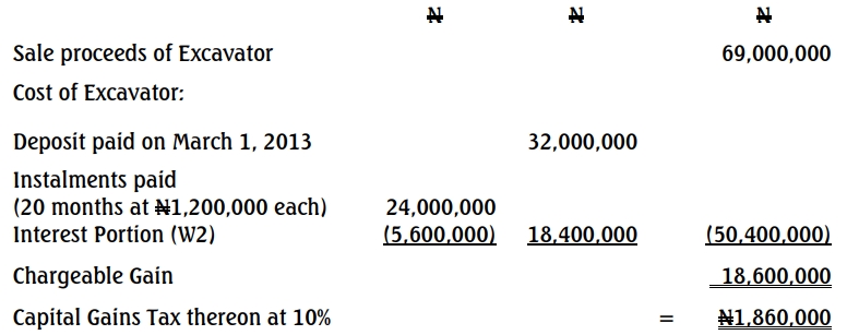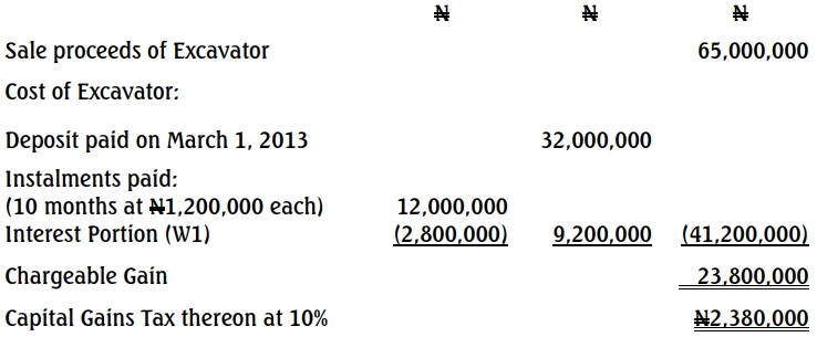 • The excavator’s cost price was N55,000,000, with the balance payable in 25 monthly installments of N1,200,000 starting April 1, 2013.