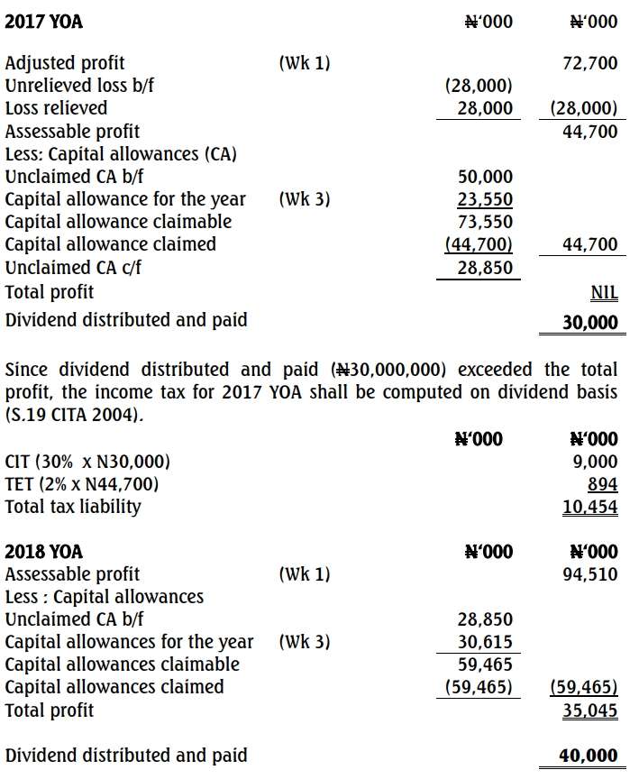 Dividend distributed and paid (N40,000,000) exceeded the profit (N35,045,000) therefore, income tax for 2018 YOA shall be computed on dividend basis (S19 CITA 2004)