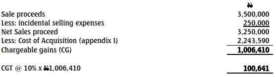 - A chargeable gain of ₦1,006,410 arises, being the difference between the consideration received (₦3,500,000) and the apportioned cost.