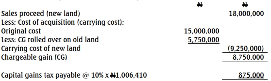 - The carrying cost of the new land is ₦9,250,000 (₦15,000,000 original cost less ₦5,750,000 chargeable gain rolled over).