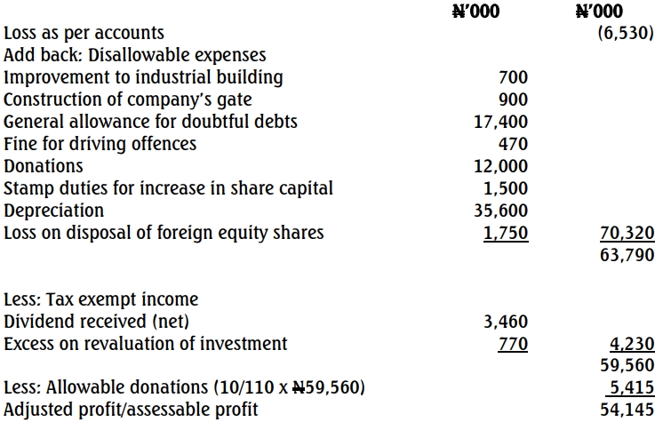 Financial records of the company for the year ended December 31, 2021, revealed an operating loss of ₦6,530,000. For tax purposes and in line with the provisions of the Companies Income Tax Act 2004 (as amended), the profit or loss made by a corporate entity has to be adjusted. When this was done, the company made an adjusted profit of ₦54,145,000.