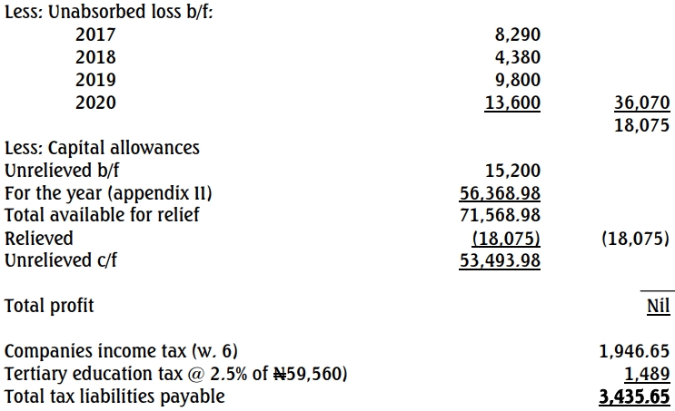 The company was able to relieve all the unabsorbed losses for the 2017, 2018, 2019, and 2020 tax years, which amounted to ₦36,070,000. However, only ₦18,075,000 out of ₦71,568,980 capital allowances available for relief was utilised, while the unutilised portion of ₦53,493,980 is deferred to next year for possible utilisation from profit.