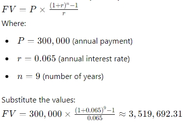 A savings scheme involves investing ₦300,000 per annum on the last day of the year. If the interest rate is 6.5%, what is the sum to be received at the end of 9 years?
