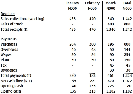 - Advance payment of N800,000 in respect of a sale of a truck will be received in March 2017.