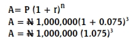 Suppose N1 million is deposited in a money deposit bank that is paying 7.5% interest per annum compounded annually. What will be the compound amount at the end of the third year?