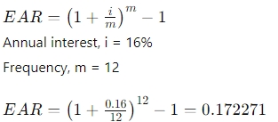 The effective annual interest rate is 17.2271%: