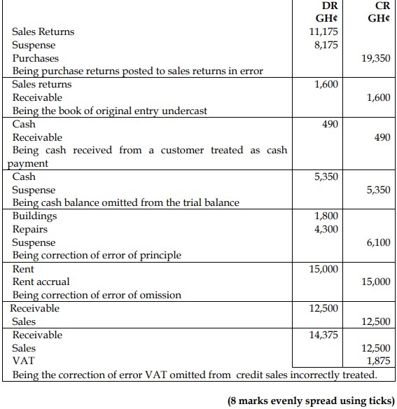 - Building repairs of GH¢4,300 were undertaken during the month ended 30 June 2018. The amount was paid by cheque, and GH¢1,800 was incorrectly credited to the building account.