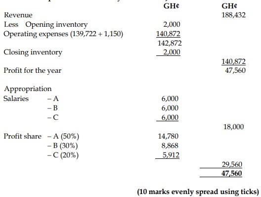 b) Ama, Baah, and Cain are in partnership, providing management services, sharing profits in the ratio 5:3:2 after charging annual salaries of GH¢6,000 each. Current accounts are not maintained. On 30 June 2019, Ama retired, and Doh was admitted into the partnership. Doh is entitled to 30% of the profits of the new partnership, with the balance being shared between Baah and Cain.
