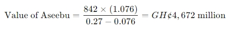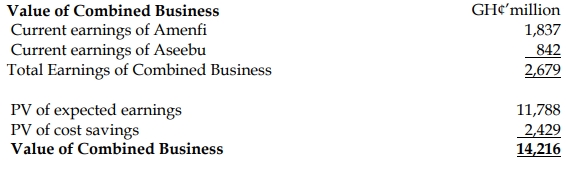Amanfi Ltd and Aseebu Ltd have beta of 1.6 and 1.1 respectively. The government treasury bill rate pays a yield of 8% and risk premium on the market is 17%. If the merger goes through, the combined company’s earnings after tax will grow at the same rate as Amanfi Ltd. The merger will lead to annual cost savings of GH¢850 million in perpetuity.