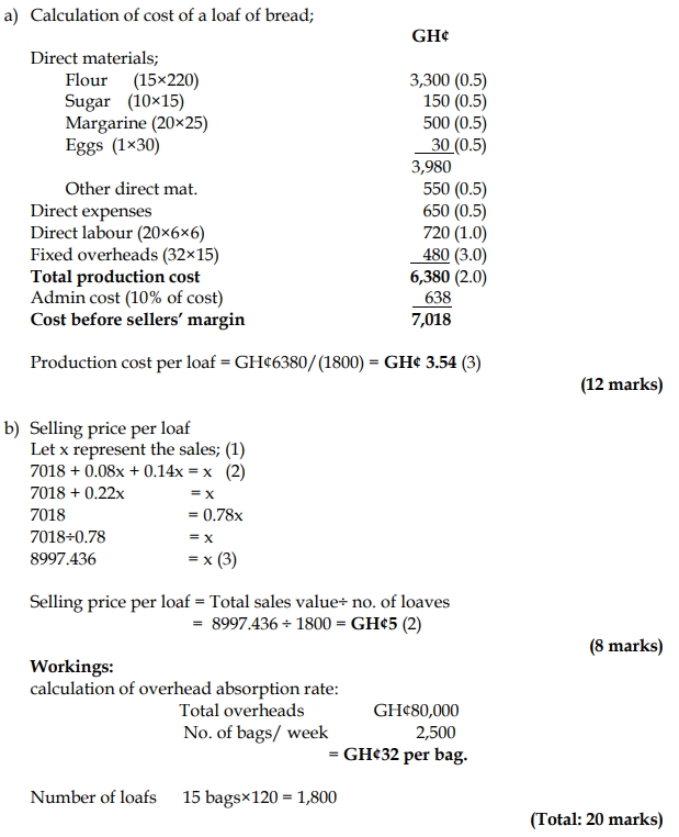 b) Calculate the selling price per loaf if profit is 14% of selling price. (8 marks)