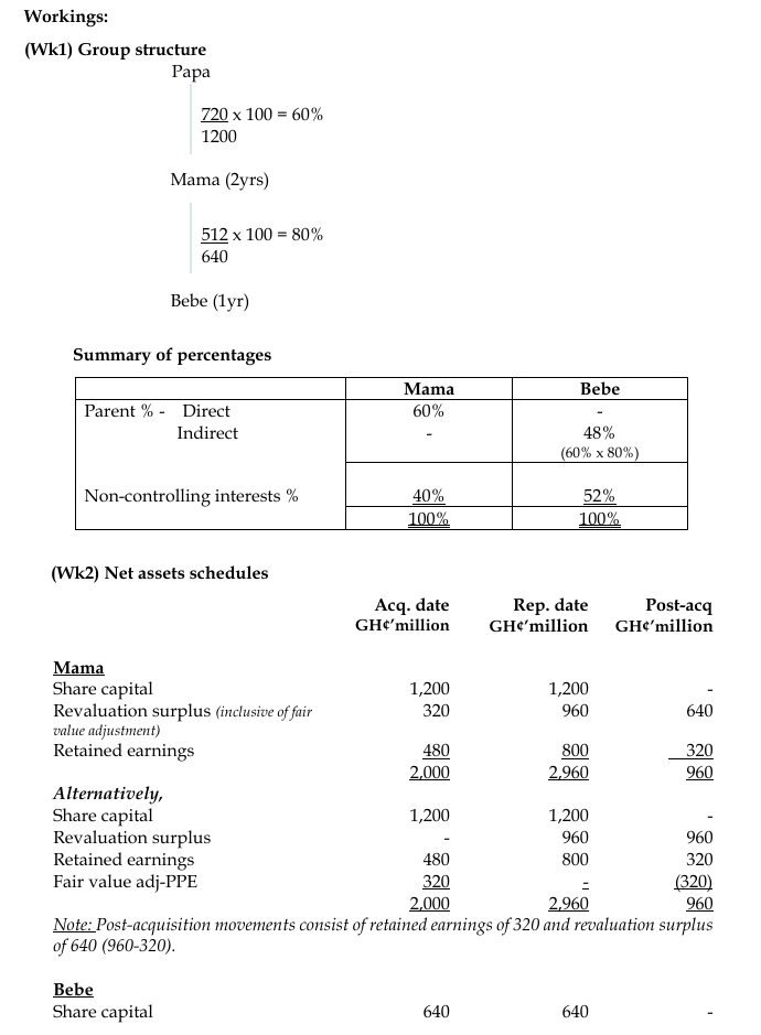 - Papa Plc bought 720 million shares in Mama Plc on 1 August 2019 at GH¢2.50 per share in cash. On that date, Mama’s retained earnings were GH¢480 million, and net assets equaled their carrying amounts except for property, plant, and equipment, which had a fair value excess of GH¢320 million.