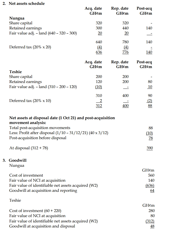 Any difference between the acquisition date fair value and book value of the identifiable net assets of both investees was due to land. Fair value adjustments should be deemed as temporary differences which are subject to tax of 20%. The fair values of identifiable net assets above are not yet adjusted for tax. Shortly after acquisition, Teshie incorporated the fair values (together with any tax effects) into its separate financial statements, but Nungua had not yet incorporated the fair values into its separate financial statements.