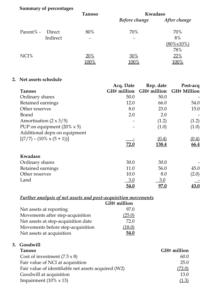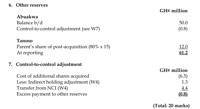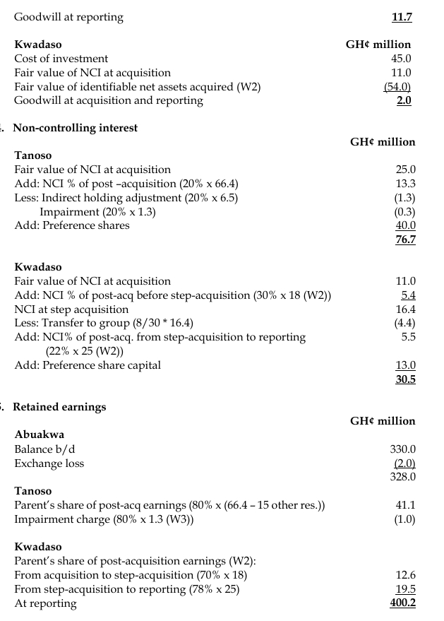 - Abuakwa acquired 20 million shares in Tanoso on 1 January 2019. The consideration, which has been correctly accounted for, was settled by Abuakwa issuing its own ordinary shares of 7.5 million. The fair value of non-controlling interest of Tanoso at the date of acquisition was GH¢25 million.