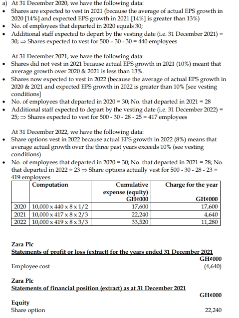 Zara Plc operates within the thriving food packaging industry in Ghana. At 1 January 2020, the firm agreed to grant 10,000 shares each to 500 employees, conditional on the employees remaining in the firm’s employment during the vesting period. The terms of the scheme indicated that the shares will vest at:
