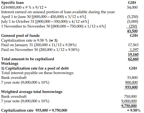 The first payment on 31st January was funded from the entity’s pool of debt. However, the entity succeeded in raising a medium-term loan for an amount of GH¢800,000 on 31st March, 2014, with simple interest of 9 percent per annum, calculated and payable monthly in arrears. These funds were specifically used for this construction. Excess funds were temporarily invested at 6 percent per annum monthly in arrears and payable in cash. The pool of debt was again used to an amount of GH¢200,000 for the payment on 30th November, which could not be funded from the medium-term loan. The construction project was temporarily halted for 3 weeks in May when substantial technical and administrative work was carried out.