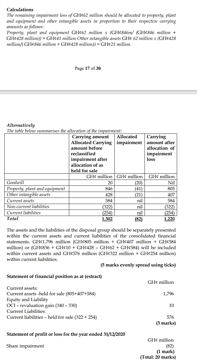 The net assets of Jamila Ltd would now have a carrying amount of GH¢1,302 million including GH¢846 million for property, plant, and equipment. On classification as held for sale, Jamila Ltd must be measured at the lower of the carrying amount and fair value less costs to sell. An impairment arises of GH¢82 million (GH¢1,302 million – GH¢1,220 million). This will first be allocated to the goodwill of GH¢20 million. The remaining impairment of GH¢62 million is allocated to non-current assets to which the measurement requirements of IFRS 5 apply. No impairment will therefore be allocated to the current assets of Jamila Ltd.