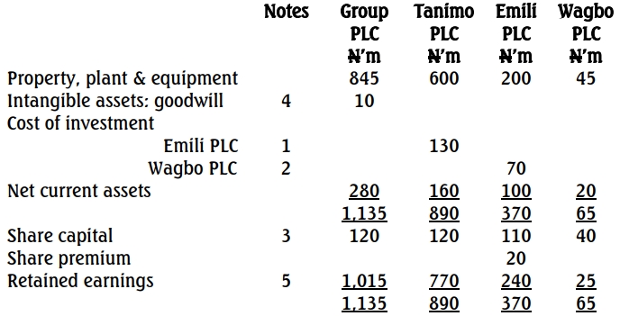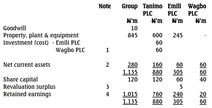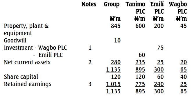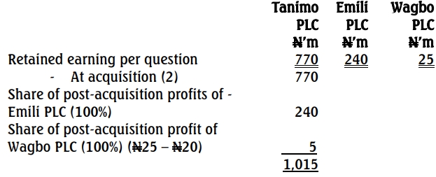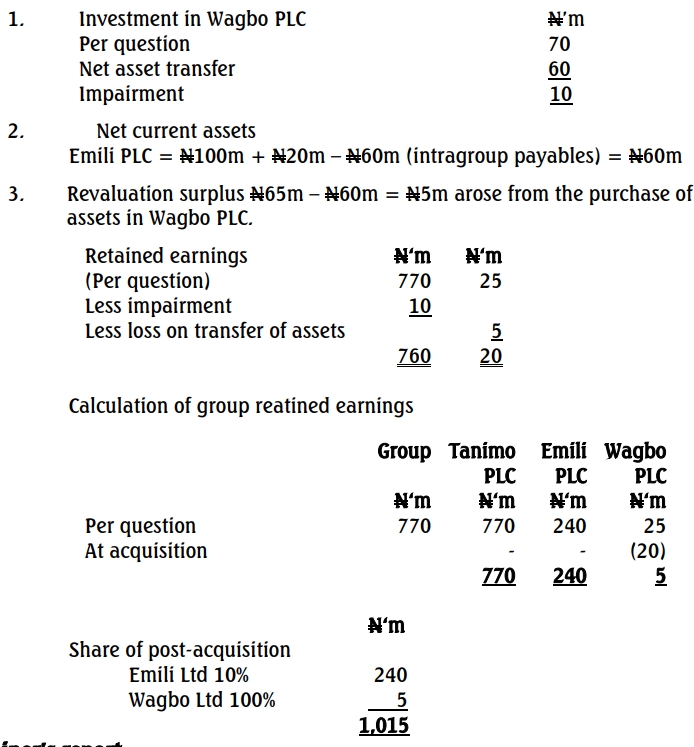 One way to simplify a group structure is rationalisation restructuring. Wagbo PLC was initially purchased at N70m and the net assets transferred to Emili PLC is N60m giving rise to goodwill of N10m. Note that investment in Wagbo PLC in Tanimo PLC book may be impaired. The investment in Wagbo PLC in Tanimo PLC’s books will be reduced to N60m and a corresponding change on the retained earnings below: