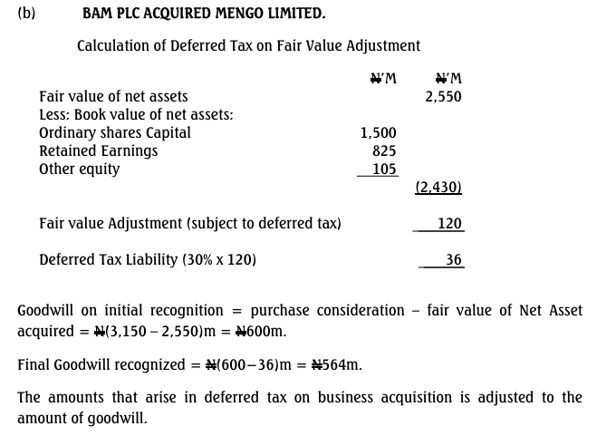The fair value of the identifiable net assets of Mango Limited at this date was N825 million, and N2,550 million and retained earnings and other components of equity were N105 million, respectively. Mango Limited’s share capital was N1,500 million.