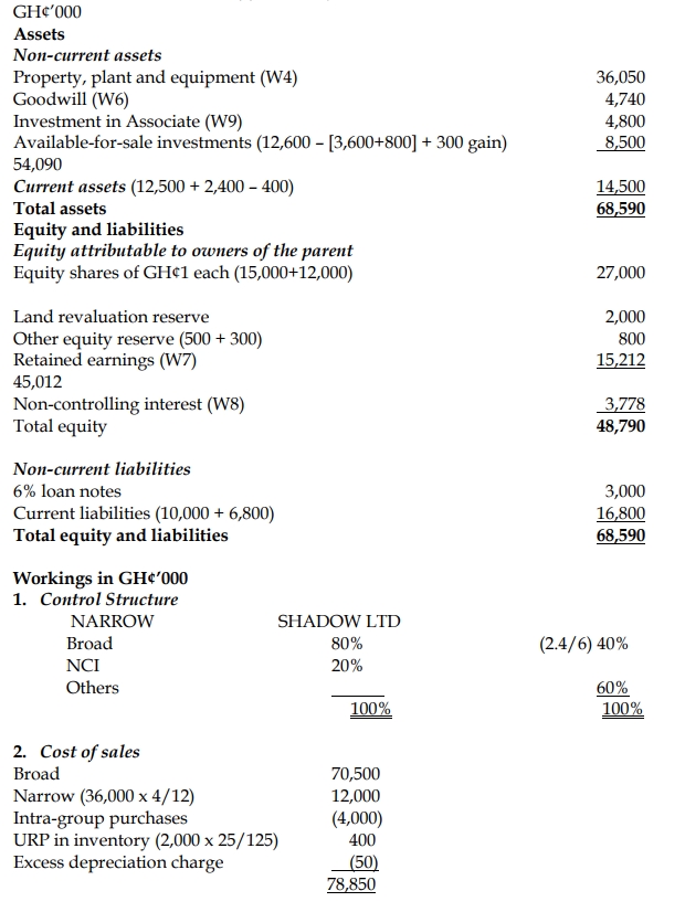 - On 1 March 2016, Broad Ltd acquired 80% of the equity share capital of Narrow Ltd. The consideration consisted of two elements: a share exchange of three shares in Broad Ltd for every five acquired shares in Narrow Ltd and the issue of a GH¢100 6% loan note for every 500 shares acquired in Narrow Ltd. The share issue has not yet been recorded by Broad Ltd, but the issue of the loan notes has been recorded. At the date of acquisition, shares in Broad Ltd had a market value of GH¢5 each, and the shares of Narrow Ltd had a stock market price of GH¢3.50 each.Broad Ltd had earlier acquired 2.4 million shares in Shadow Ltd on the stock market at a price of GH¢1.50 per share on 1 January 2016.