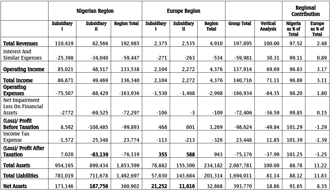 Income Statement: The Nigerian region contributed 97.52% of the entire revenue of the group, with interest and similar expenses amounting to 30.31% of the group’s total revenue, 99.11% of which originated from Nigeria. This left an operating income representing 69.69% of the group’s revenue.