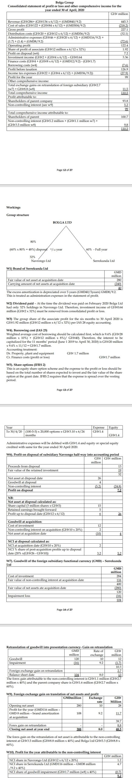 Bolga Ltd is a limited liability company in Ghana, which has investments in a number of other companies. The draft statements of profit or loss for Bolga Ltd and its other investments for the year ended April 30, 2020, are given below: