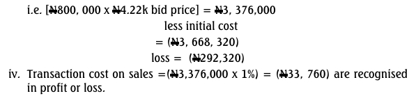 c. During the year 2021, Pelumi Limited invested in 800,000 shares in an NGX quoted company. The shares were purchased at N4.54 per share. The broker collected a commission of 1% on the transaction. Pelumi Limited elected to measure their shares at fair value through other comprehensive income (FVTOCI). The quoted share price as of December 31, 2021, was N4.22 to N4.26. Pelumi Limited decided to adopt a ‘sale and buy back’ strategy for the shares to realise a tax loss and therefore sold the shares at the market price on December 31, 2021, and bought the same quantity back the following day. The market price did not change on January 1, 2022. The broker collected a 1% commission on both transactions.