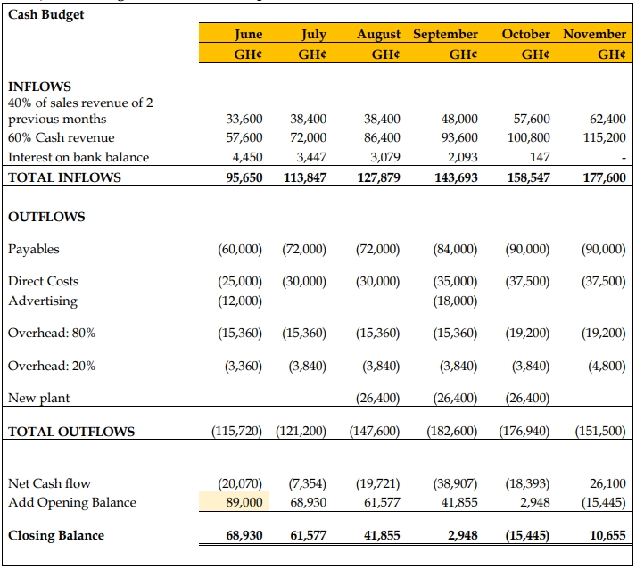 Raw materials used for the footwear will be held for one month before they are taken into production. Purchases of raw materials will be on one month’s credit. The cost of raw materials is GH¢60 per unit of production. Other direct production expenses, including labour, are GH¢25 per unit. These will be paid in the month incurred. Various production overheads, which during the period to 30 May had run at GH¢21,600 a month, are expected to rise to GH¢24,000 each month from 1 June to 30 September. These are expected to rise again from 1 October to GH¢28,800 a month and to remain at that level for the foreseeable future. These overheads include a steady GH¢4,800 each month for depreciation. Overheads are planned to be paid 80% in the month of production and 20% in the following month.
