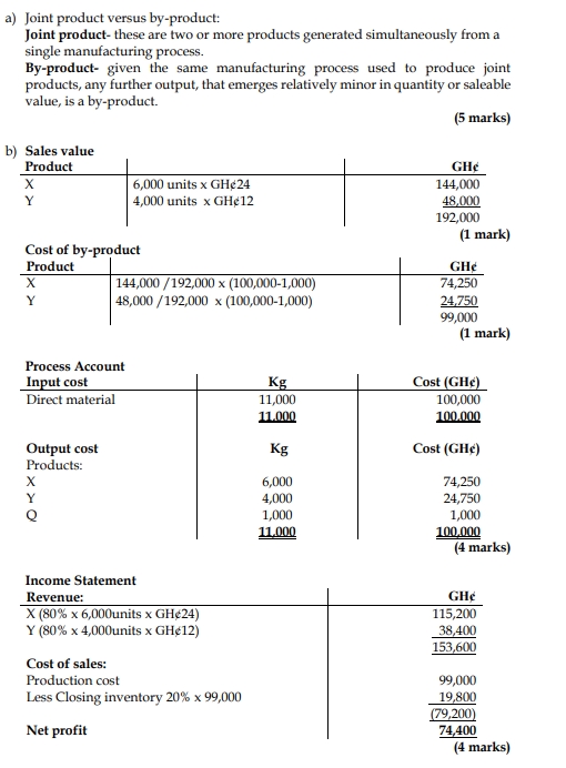 b) Odotobiri Ltd produces joint products (X, Y) from an identical manufacturing process. In December 2023, 11,000kg of materials were put into the production process. The total costs of processing (direct materials and conversion costs) were GH¢100,000. Output was 6,000 units of product X and 4,000 units of product Y and 1,000 units of a by-product Q. X has a sales value of GH¢24 per unit and Y has sales value of GH¢12 per unit. By-product Q has a sales value of GH¢1 per unit. The company has a policy to apportion joint costs based on sales value at a split-off point. 80% of the output of both X and Y was sold by the month-end.