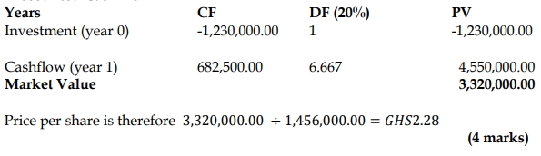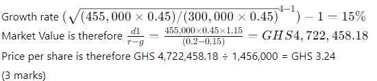Blanco Ltd has in issue 2,480,000 ordinary shares with each share earning approximately GH¢0.79 to give a Price-Earnings ratio of 8. Shareholders expected rate of return is 18%.