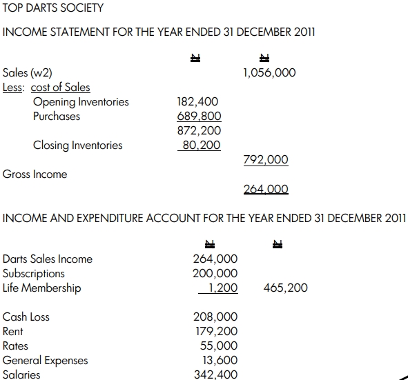 (a) Draw up a Darts Income Statement for the year 2011 to calculate the gross profit on Darts sold. The cash stolen should be credited to this account, with a debit shown in the Income and Expenditure Account.