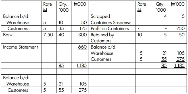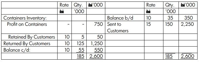 Nimyaro Limited sold goods in containers, which are charged out to customers at N15 each. Customers were credited with N10 for each container returned before the expiration of the due dates. At the end of the year, inventories of containers in warehouse and all returnable containers in the hands of customers were valued at N5 each.
