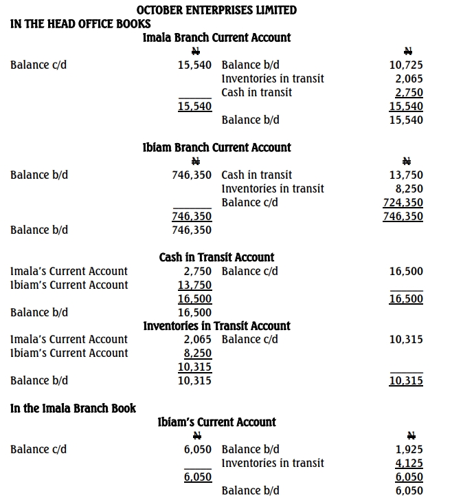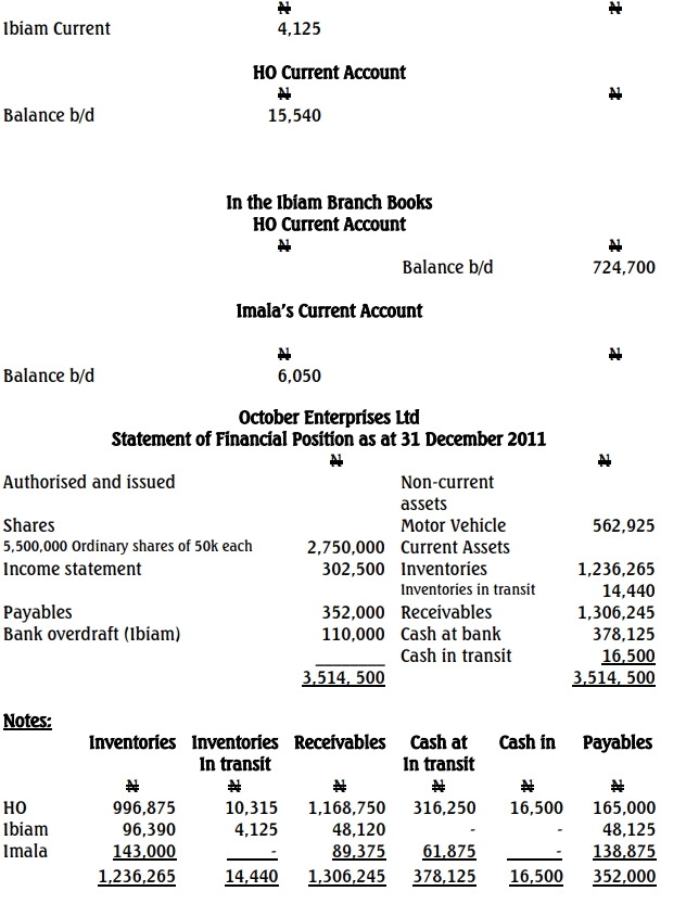 October Enterprises Limited has its Head office in Lokoja with branches in Ibiam and Imala. The following are the separate Statements of Financial Position of the Head Office (HO) and branches as at 31 December 2012: