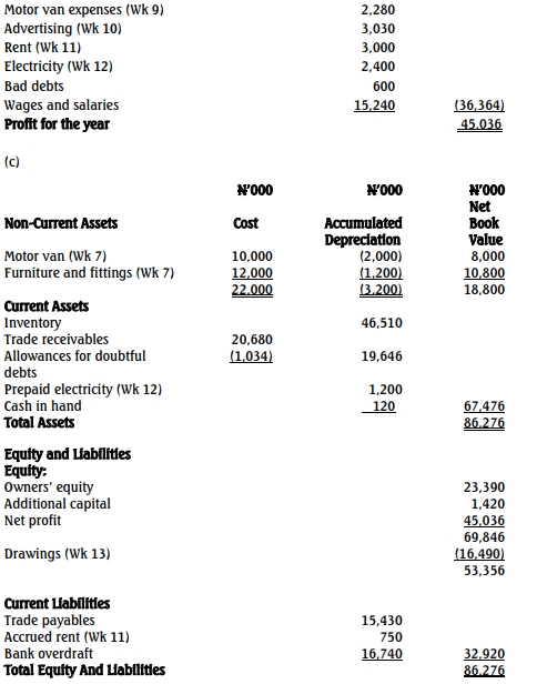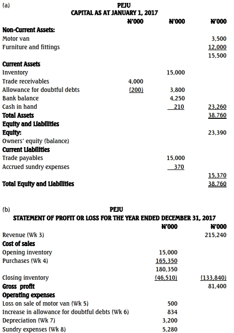 Peju runs a big grocery store in Ibadan, but many of her accounting records were destroyed by a flood incident close to the end of the financial year of the business. From the records that were retrieved after the incident, the following balances were gathered in respect to her assets and liabilities at the beginning of the year: