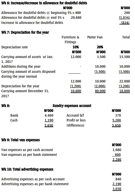 (v) Allowances for doubtful debts are raised at the beginning and end of the year at 5%. Bad debts of N600,000 had been written off the trade receivables as at December 31, 2017.