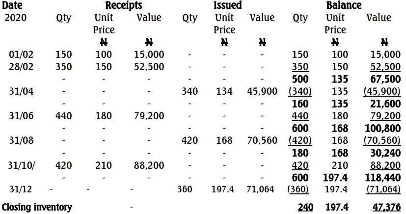 Oyin Limited purchases and sells identical articles. The table below shows the inventory movement in the store, and the company has a policy of using the weighted average cost method in its storekeeping. The company’s accounting period ends on December 31 each year.