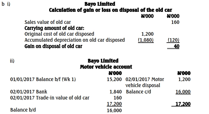 ii. Show how the purchase of the new car and the disposal of the old car will be recorded in the ledger accounts of Bayo Limited. (8 Marks)