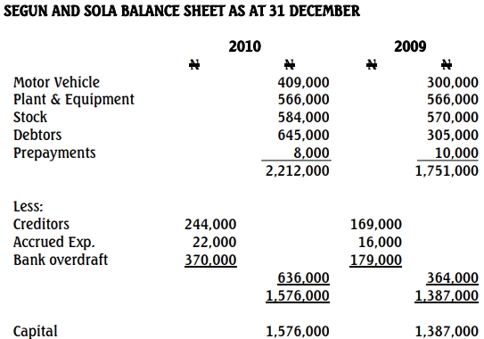 Sola introduced capital of N1,000,000 on 1 January 2009 and N200,000 on 1 January 2010. He withdrew N360,000 from the business in 2009 and N480,000 in 2010.