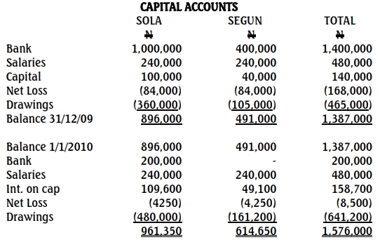 Segun and Sola went into partnership on 1 January 2009. The partnership agreement specifies that both partners should maintain Capital Accounts without Current Accounts. Each partner will be entitled to salary of N240,000 per annum and interest of 10% on capital at the end of the year. Profits and losses are to be shared equally after salaries and interest on capital have been taken into account.
