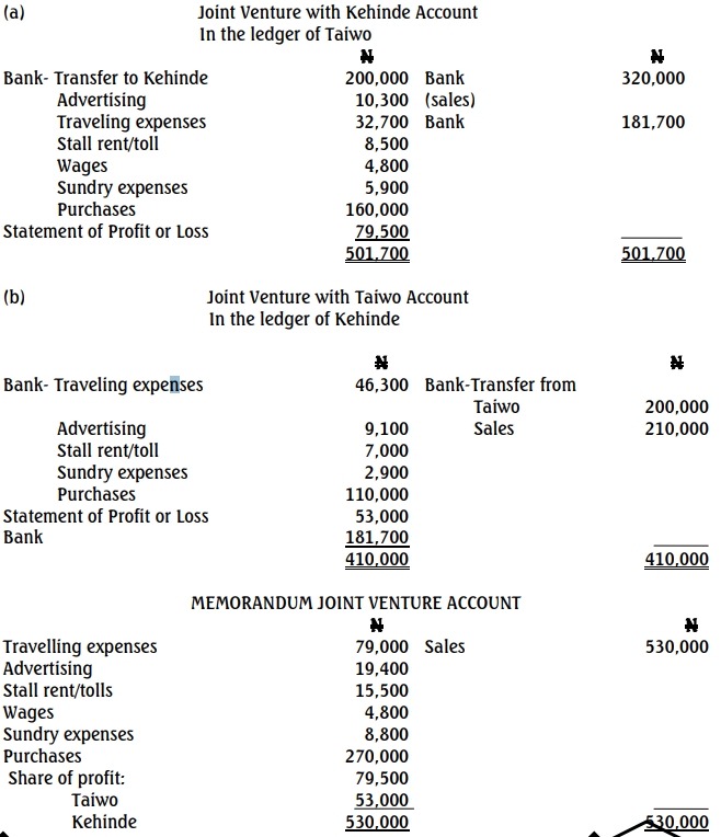 Taiwo and Kehinde entered into a joint venture to acquire packaging materials for table water production and to sell them to table water producers. They agreed to share joint venture profits or losses in the ratio 3:2, respectively.