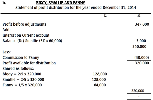 b. Biggy and Smallie were in partnership, sharing profits and losses in the ratio 2:1. They agreed to admit Fanny into the partnership from January 1, 2014. Fanny is to introduce N140,000 out of which N130,000 is to be his fixed capital. He is to receive a commission of N30,000 per annum in addition to a share of profit. The new profit-sharing ratio is 2:2:1 to Biggy, Smallie, and Fanny, respectively. Other provisions of the Partnership Deed are: