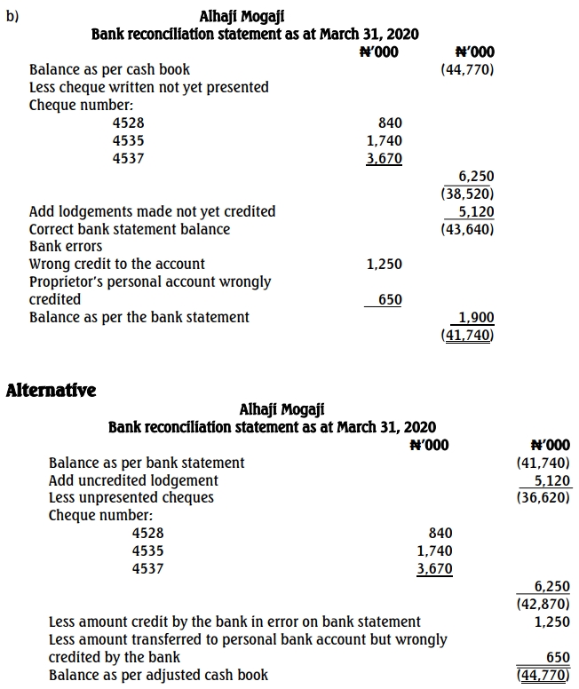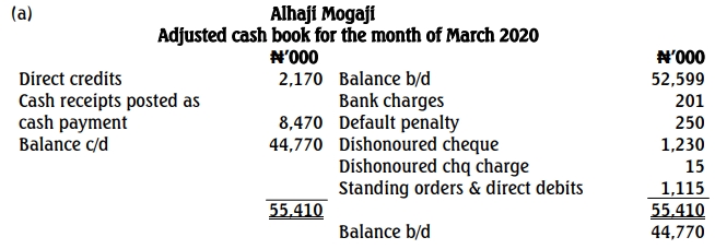 On April 6, 2020, Alhaji Mogaji received his bank statement for the month ended March 31, 2020. The bank statement showed a balance of N41,740,000 (overdraft) as at March 31, while the cash book showed a balance of N52,599,000 (credit) as at that date. On examination of the cash book and the bank statement the following were discovered: