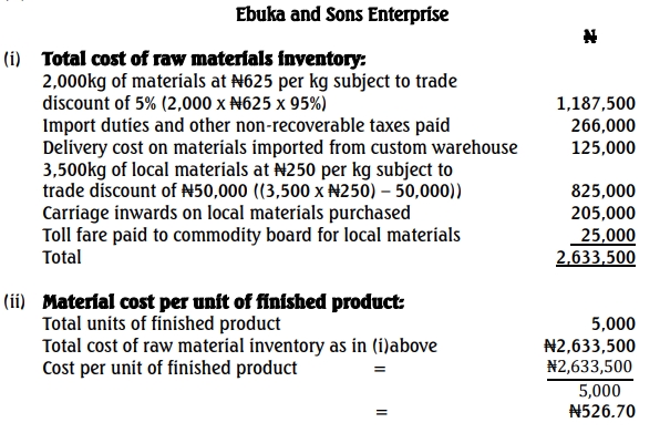 - 3,500kg of local materials at ₦250 per kg subject to a trade discount of ₦50,000.