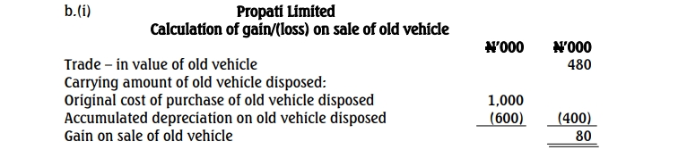 Propati Limited has a fleet of motor vehicles that are used to distribute goods to the market. As at July 2020, the cost of the vehicles was ₦750,000,000 and their accumulated depreciation was ₦30,500,000. On January 1, 2021, the company bought a new vehicle for ₦2,800,000. One of the old vehicles, which was acquired 3 years ago at a cost of ₦1,000,000 with accumulated depreciation of ₦600,000, was accepted by the seller in part-exchange at a value of ₦480,000.