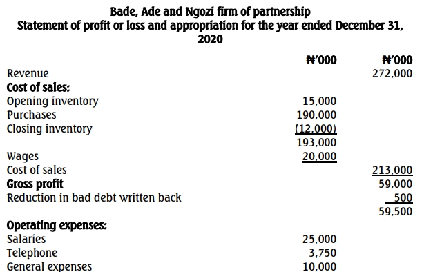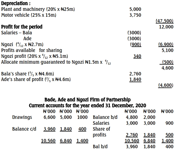 Bala and Ade are to continue their old profit-sharing ratios, and Ngozi’s 20% share of profits is guaranteed at a minimum of N1,500,000 per annum by the old partners.